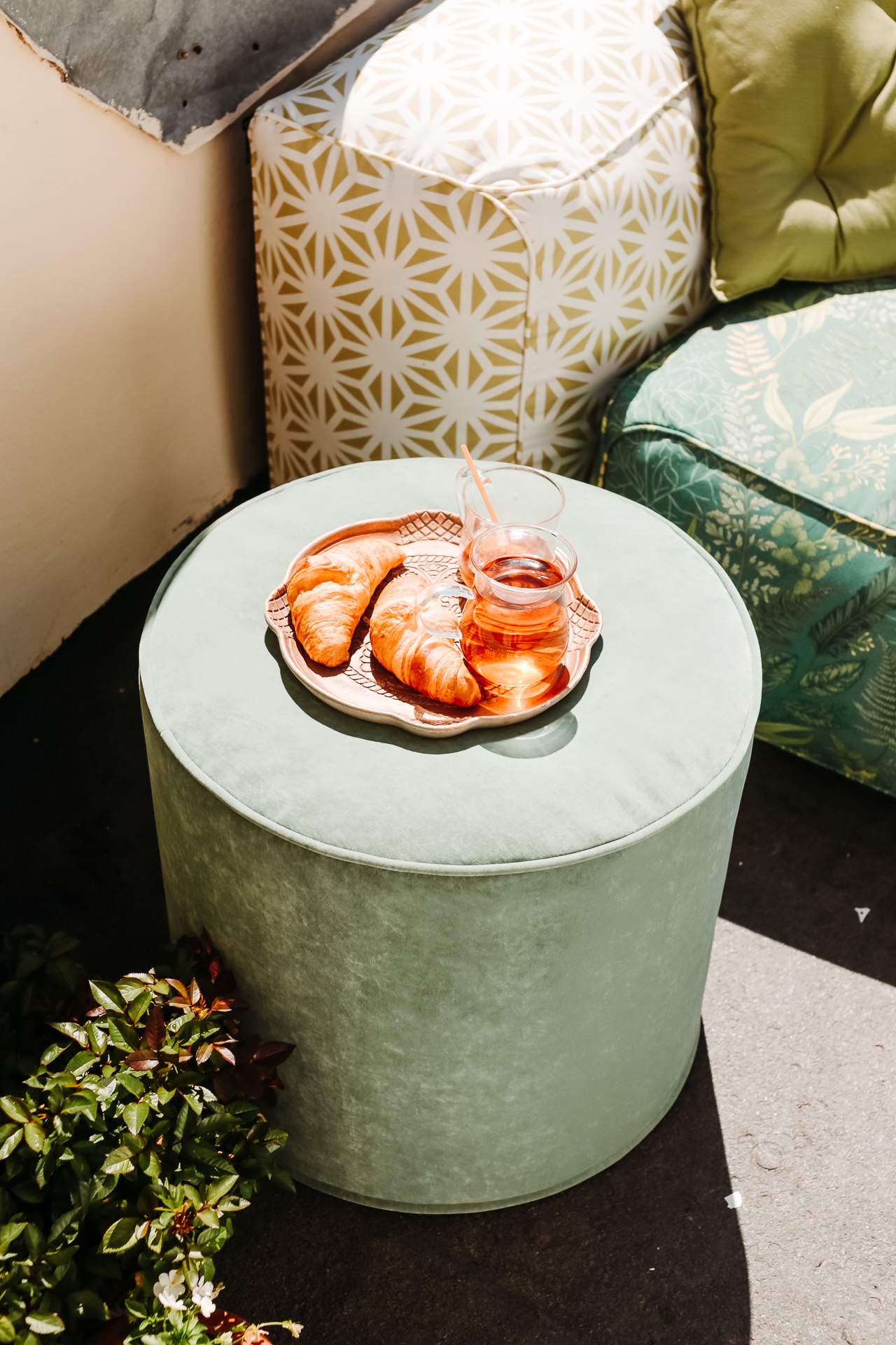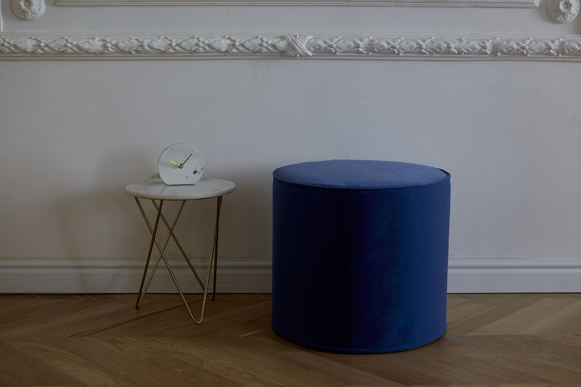 В спальне мягкий бархатистый пуф-цилиндр заменит стул рядом с туалетным столиком.