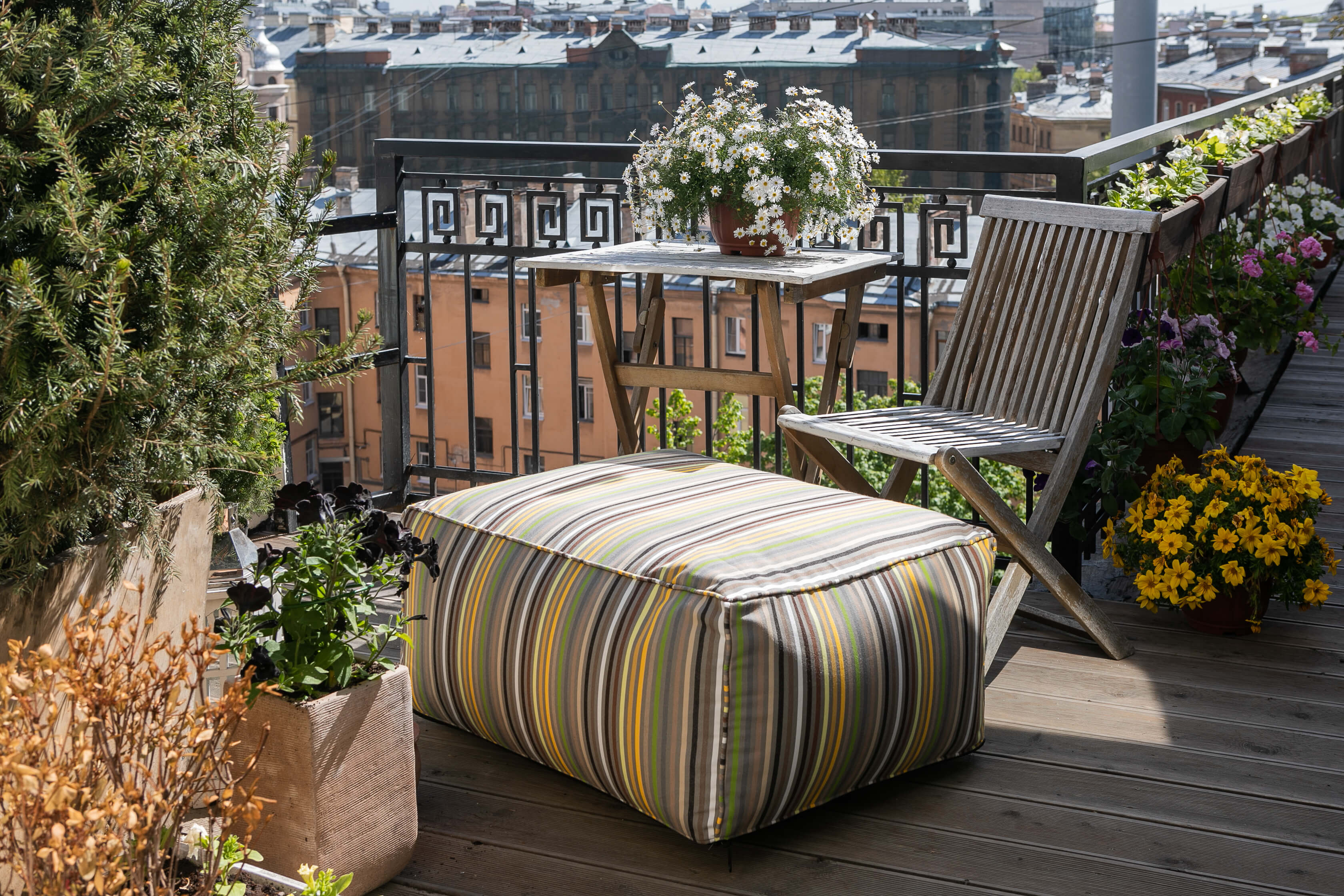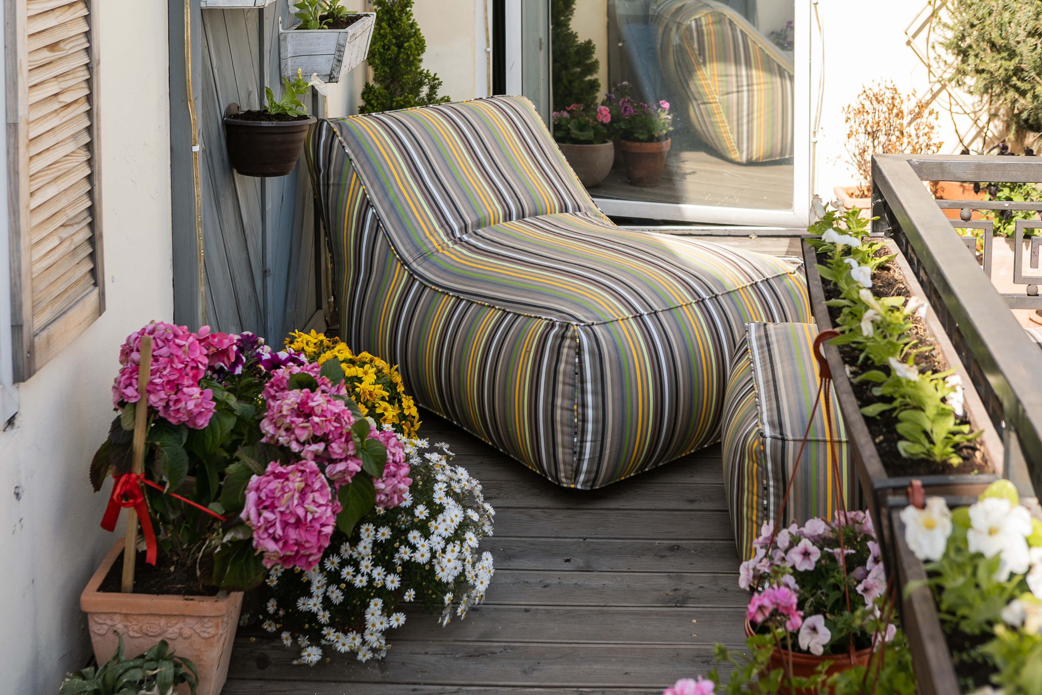 Любите почитать книгу или поспать на свежем воздухе? Разместите лежак с матрасом и подушкой-валиком в тени деревьев, поставьте рядом пуф или журнальный столик и отдыхайте с удовольствием.