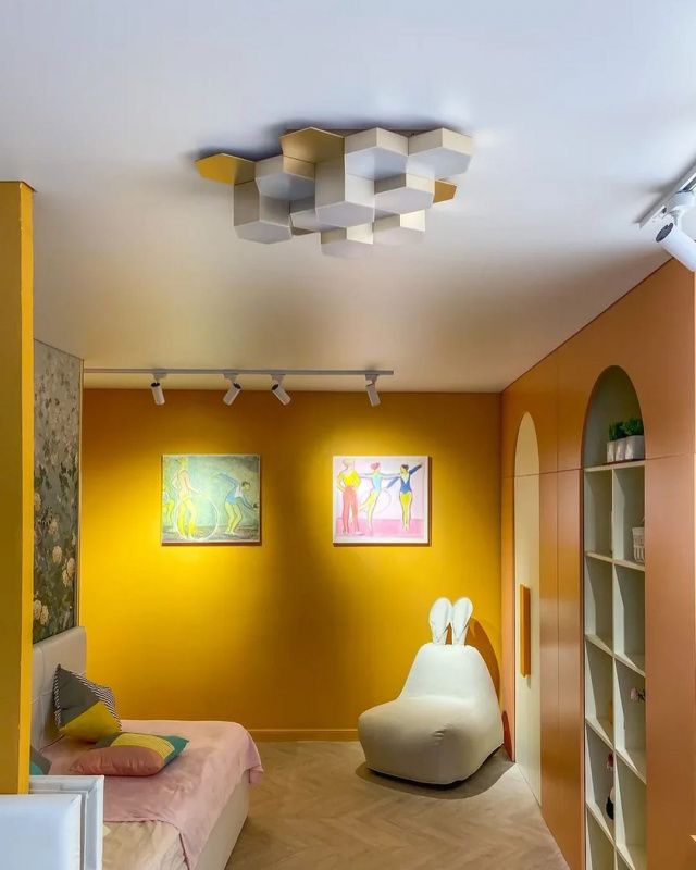 Превращая старую родительскую спальню в детскую для двух девочек-гимнасток, Алексей планировал создать пространство, которое будет интересно маленьким хозяйкам сейчас и останется актуальным, когда они подрастут. Поэтому яркий жёлтый перекликается с женственным коралловым и спокойным бежевым.