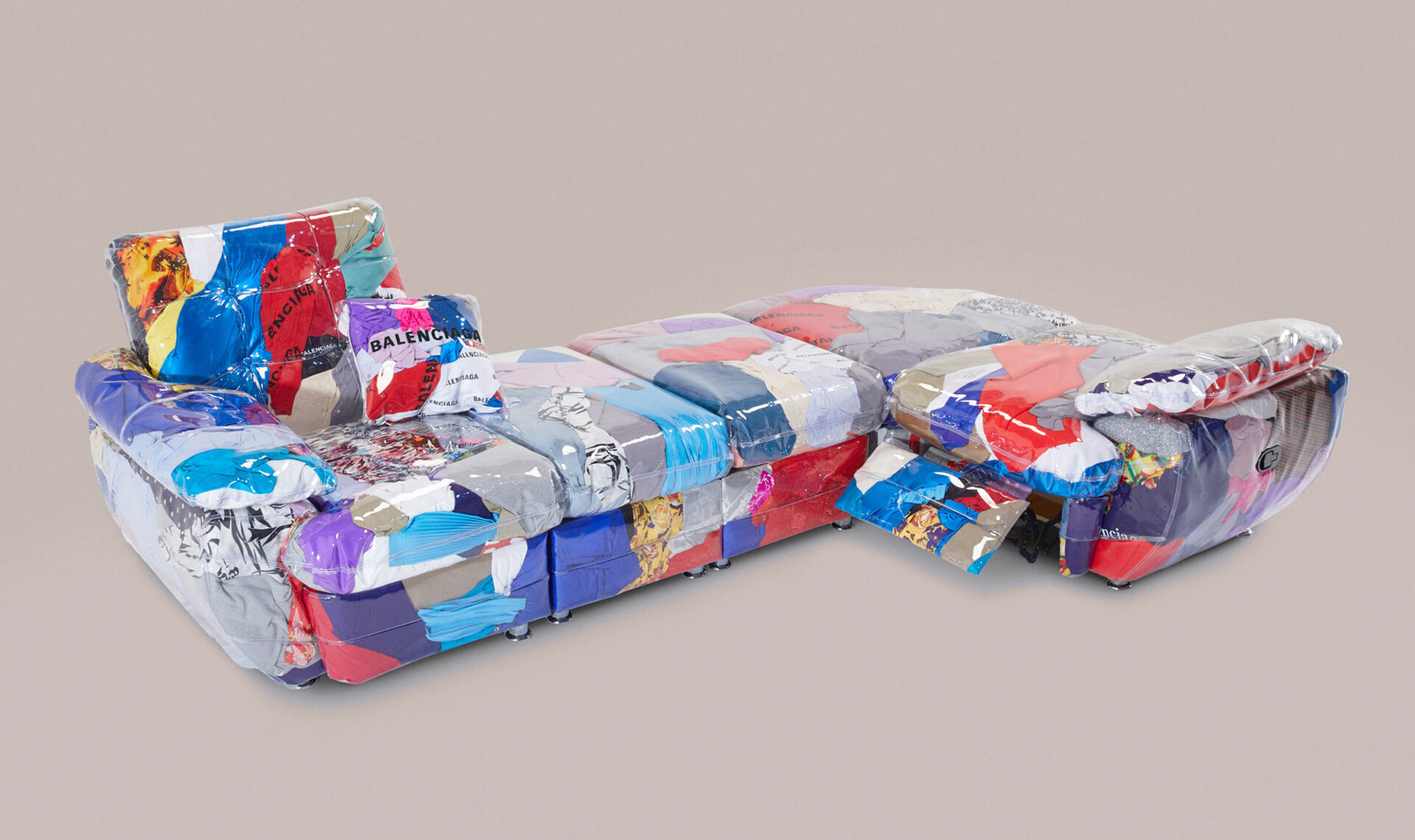 Дизайнер Гарри Нуриев создал диван из… нераспроданной одежды Balenciaga. Необычный угловой диван состоит из нескольких прозрачных элементов, плотно набитых нераспроданной и поврежденной одеждой. Это один из проектов, поддерживающих идею ответственного потребления.