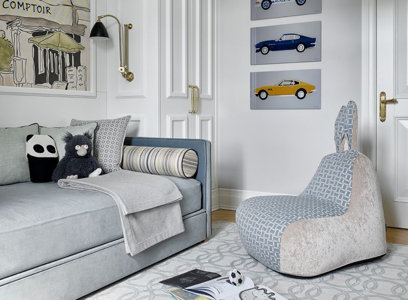 Чтобы в вашем доме поселилась неповторимая мебель, не обязательно изобретать что-то новое: достаточно подобрать стильное сочетание тканей для существующей модели. Например, интерьере детской для журнала AD мы добавили ткань Charade Trick с геометрическим узором на внутреннюю часть ушек и сиденье.