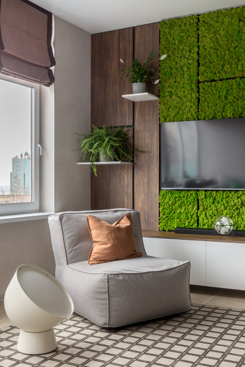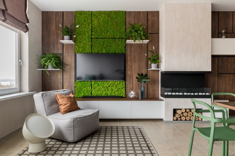 Большую площадь кухни-гостиной обставили минималистично, но функционально. Центром композиции выступила колонна с камином. Она делит первенство с ярким панно из мха на стене за телевизором.