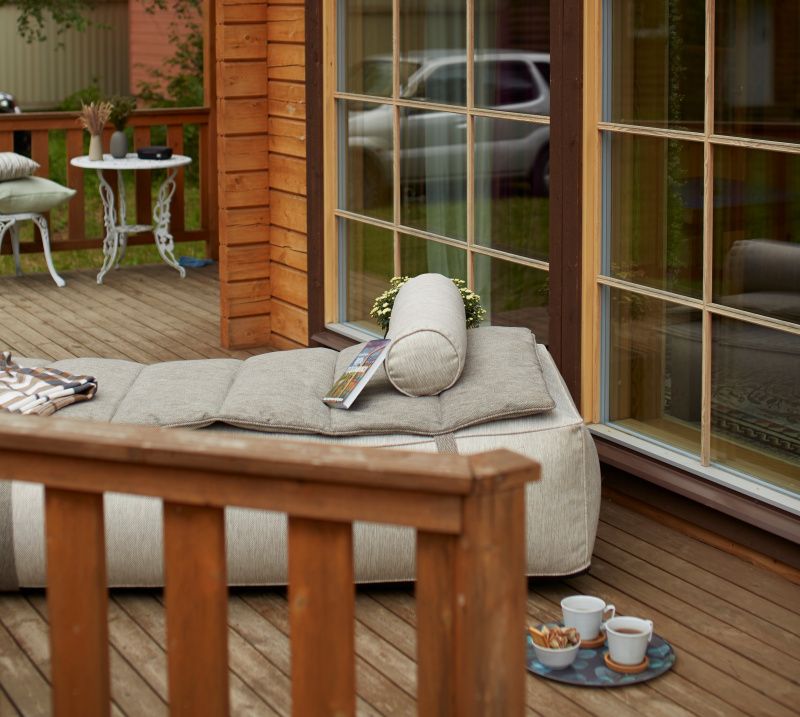 Кресло в уличной ткани подходит для использования как в помещении, так и на открытом балконе, террасе, во дворе загородного дома. Уникальная, приятная на ощупь, воздухопроницаемая ткань внешнего чехла не боится загрязнений, влаги и прямых солнечный лучей, устойчива к перепаду температуры.