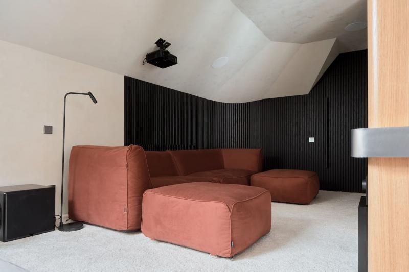 Украшение зоны гостиной – модульный бескаркасный диван Lite, состоит из двух угловых лежаков и двух пуфов. Хорошо сохраняет форму за счет системы внутренних лент, поэтому лежак можно поставить не только у стены. Для обивки модулей использовали ткань из коллекции Velutto, которая легко чистится и обладает высокой износостойкостью.